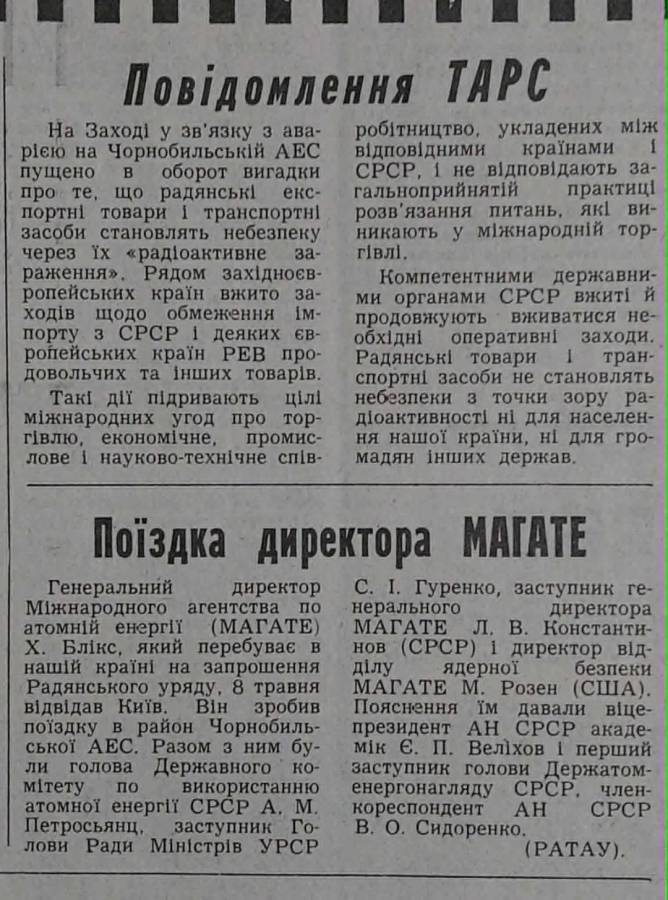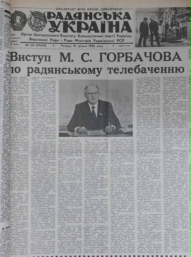 Текст виступу М. Горбачова по телебаченню був надрукований і в газетах. «Радянська Україна», 15 травня 1986. Гірка правда за фасадом оптимізму