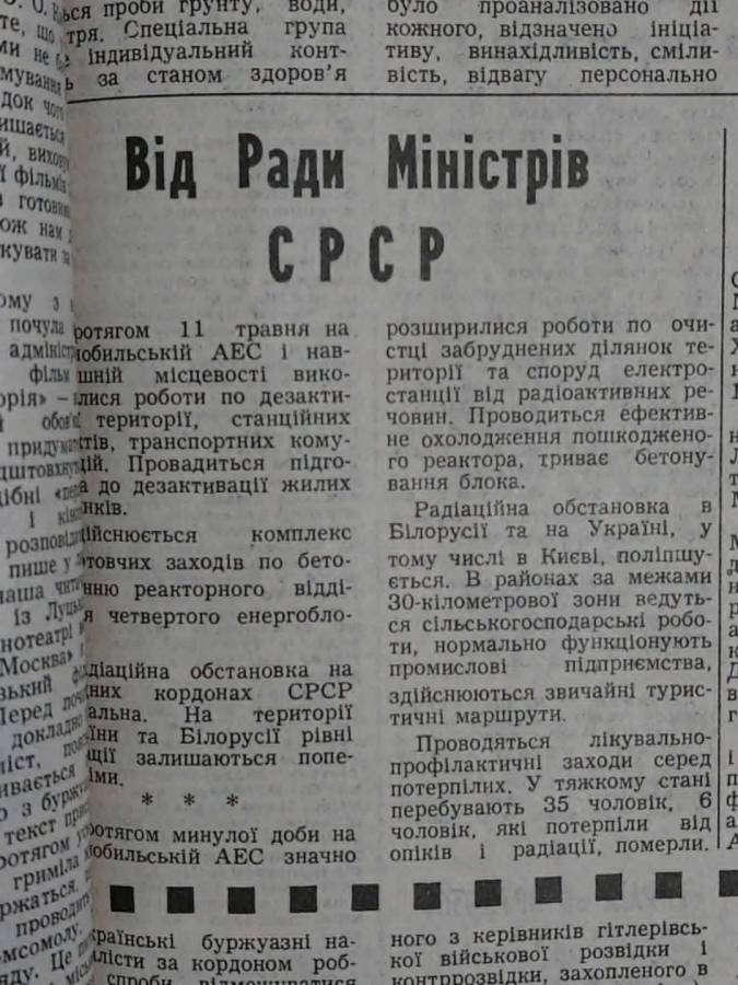 29 квітня, з дозволу Москви, інформацію про аварію надрукували майже всі українські газети – три рядки тексту під спортивними новинами: «Від Ради Міністрів СРСР. На Чорнобильській атомній електростанції сталась аварія, пошкоджений один з атомних реакторів. Вживається заходів для ліквідації наслідків аварії. Потерпілим надається допомога. Створено урядову комісію».