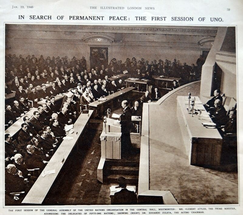 Перше засідання Генеральної асамблеї ООН відбулось у Лондоні, в центральній залі Вестмінстера. Подію висвітлювали приблизно 800 журналістів – в рази більше, ніж було самих учасників засідання. До речі, це була перша міжнародна конференція, що транслювалася телебаченням.
