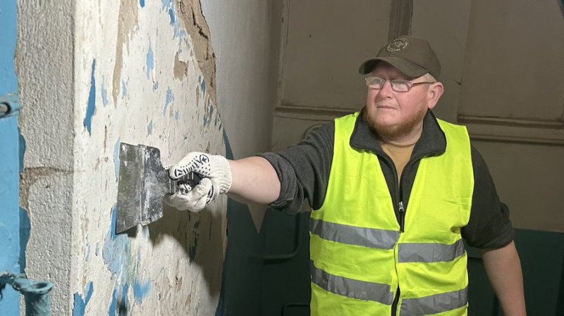 Волонтер шпаклює стіну у гімназії. Суспільне Миколаїв/Назарій Рубаняк