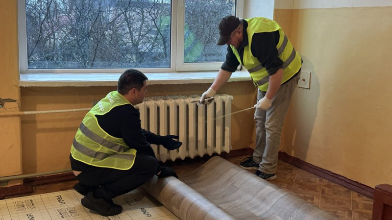 Надихнувшись прикладом батька-волонтера, Кирило долучився до Добробату. Чоловік доєднався до ремонтних робіт у миколаївській гімназії. Наразі він разом із колегами простеляє лінолеум у закладі.