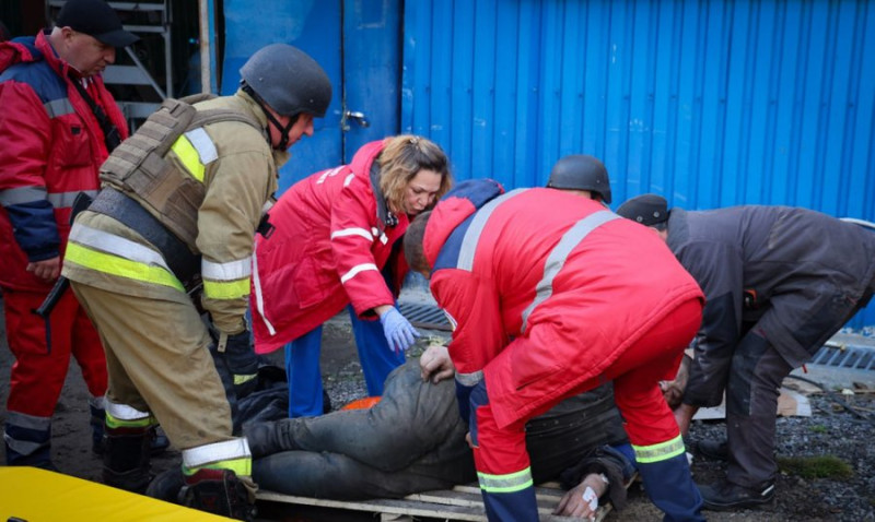 Медики разом із рятувальниками надають допомогу пораненому. Миколаїв, 13 листопада 2025 року. Головне управління ДСНС Миколаївщини