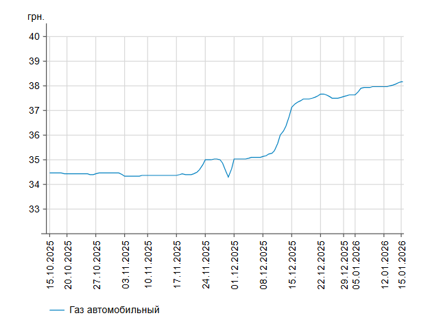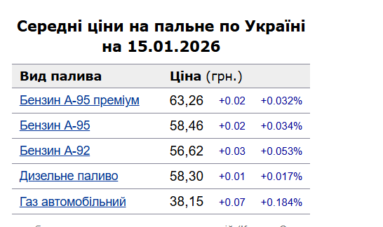 У четвер, 15 січня, середня ціна на бензин марки А-95 зросла на 2 коп. до 58,46 грн/л, на дизельне пальне — на 1 коп. до 58,3 грн/л.