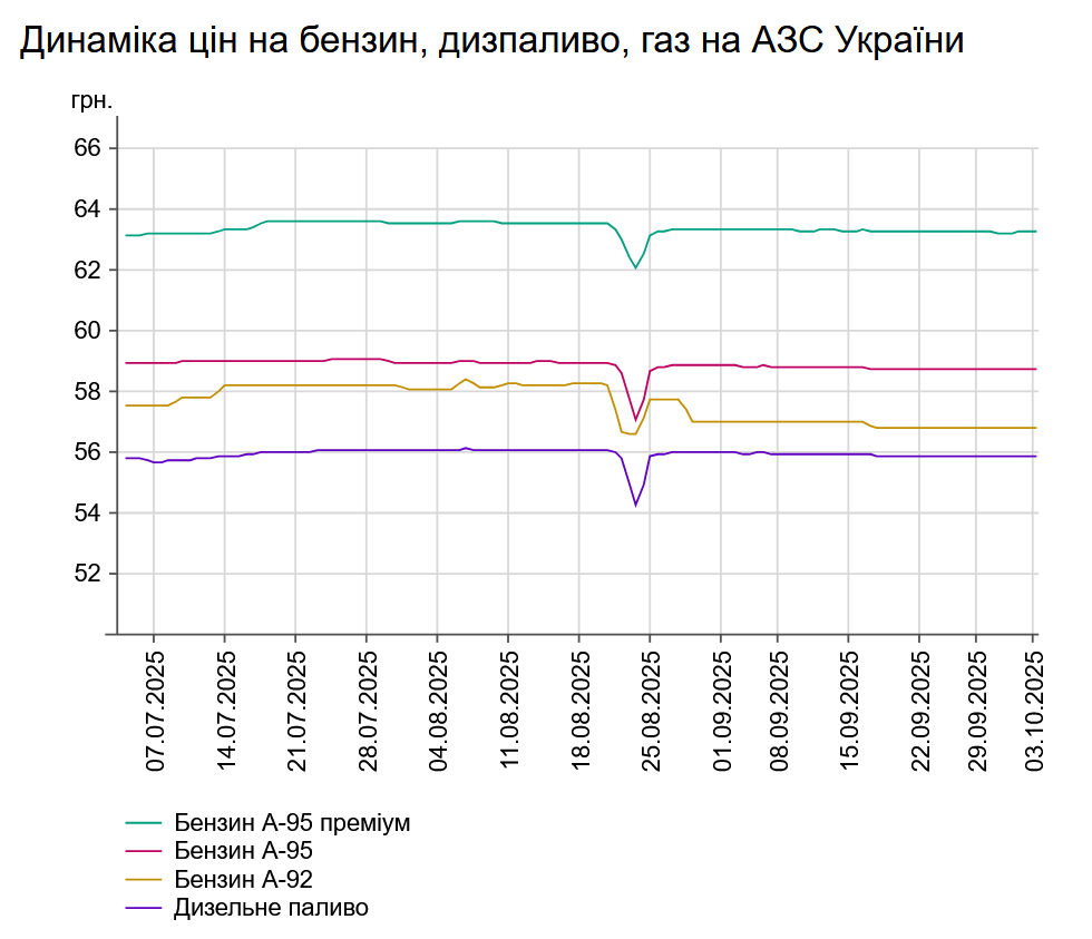 У п'ятницю, 3 жовтня, середня ціна на бензин марки А-95 залишається на рівні 58,73 грн/л, на дизельне пальне — на рівні 55,88 грн/л.