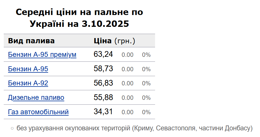 Як повідомлялося, у четвер, 2 жовтня, середня ціна на бензин марки А-95 залишалася на рівні 58,73 грн/л, на дизельне пальне — на рівні 55,88 грн/л.