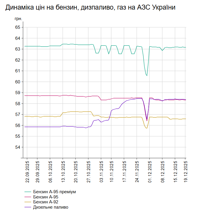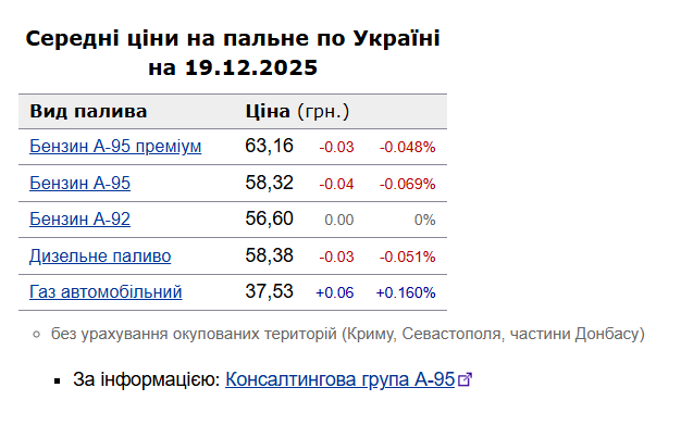 У п'ятницю, 19 грудня, середня ціна на бензин марки А-95 знизилася на 4 коп. до 58,32 грн/л, на дизельне пальне — на 3 коп. до 58,38 грн/л.