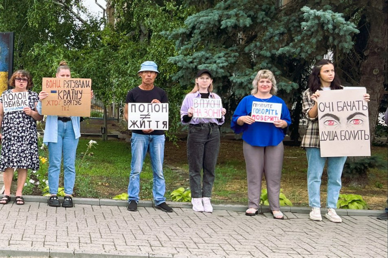 У Веселиновому на площі Мозолевського зібралися близько 30 людей — це дружини, батьки, друзі військовослужбовців, які перебувають у російському полоні чи вважаються зниклими безвісти. Це перша така акція у селищі.