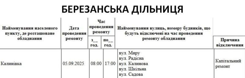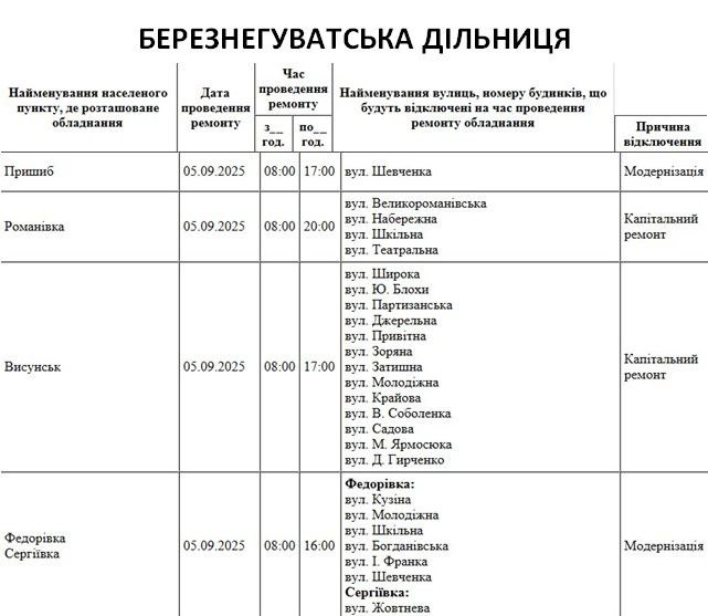 Графік відключення світла по адресах 5 вересня, Березнегуватська дільниця. АТ «Миколаївобленерго»