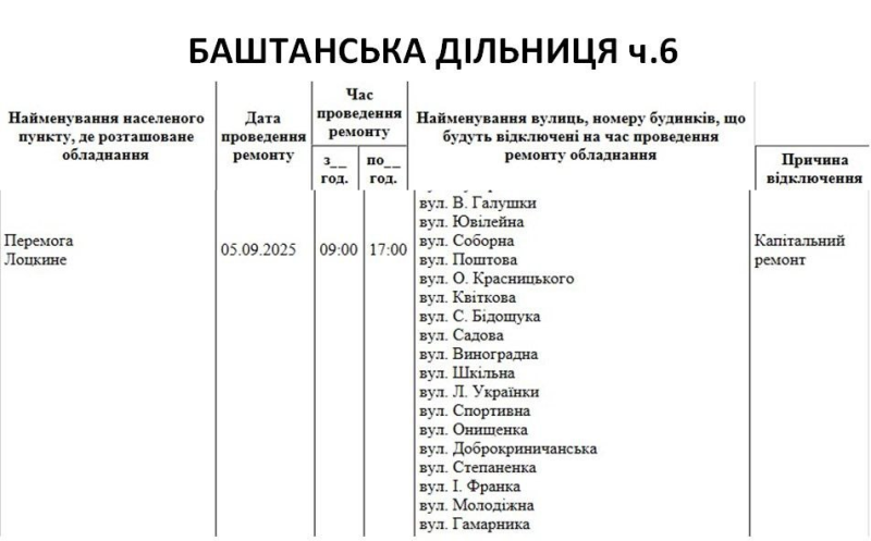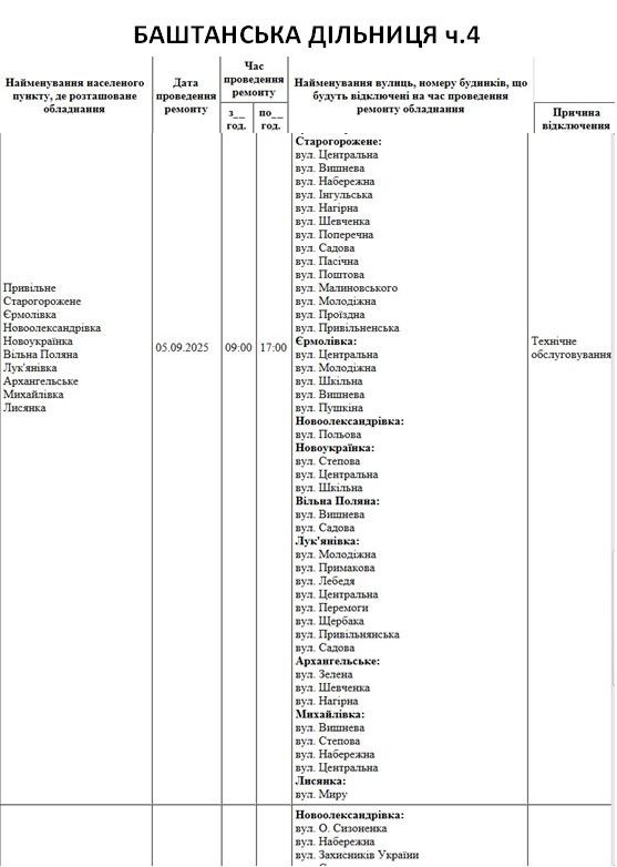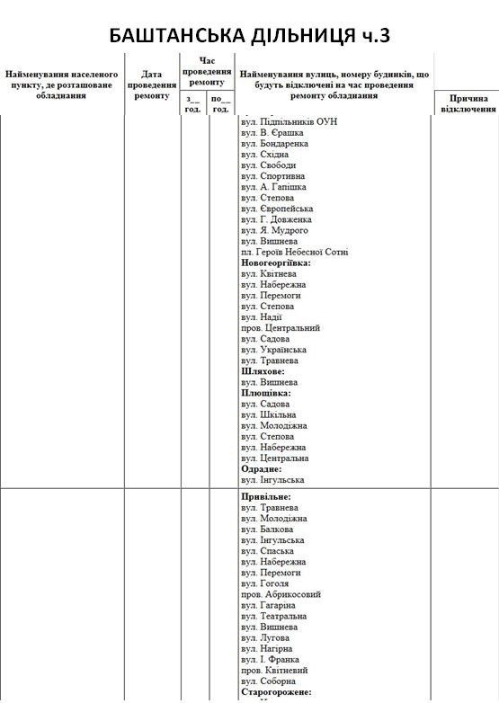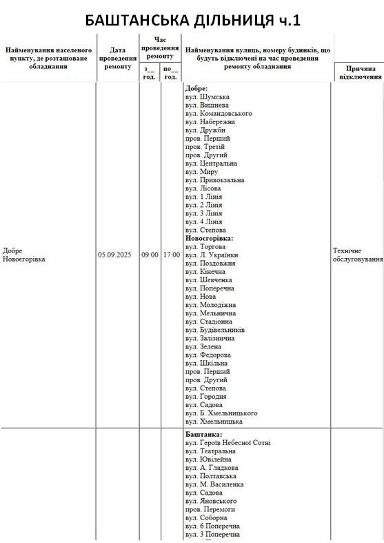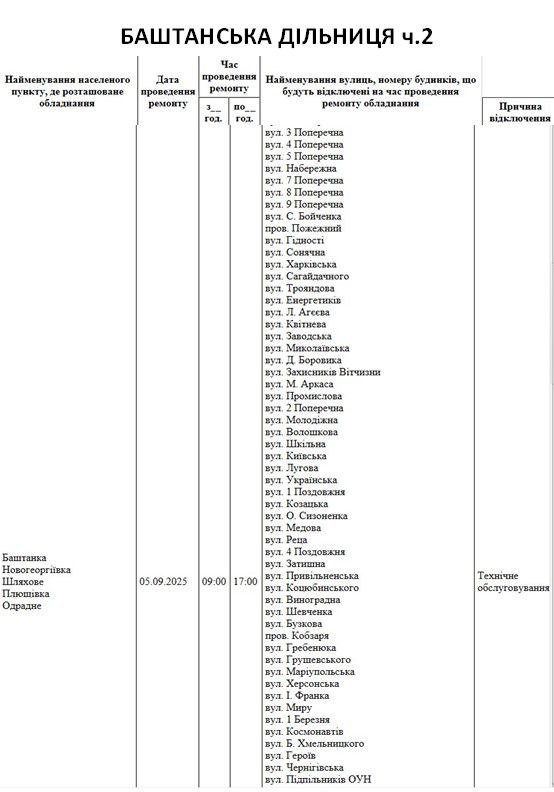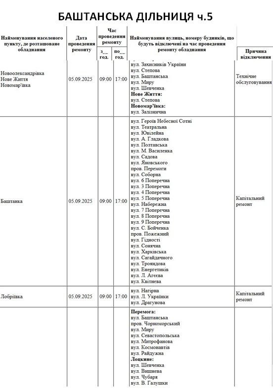 Графік відключення світла по адресах 5 вересня, Баштанська дільниця. АТ «Миколаївобленерго»