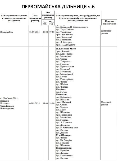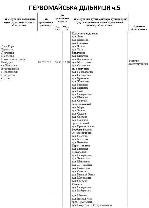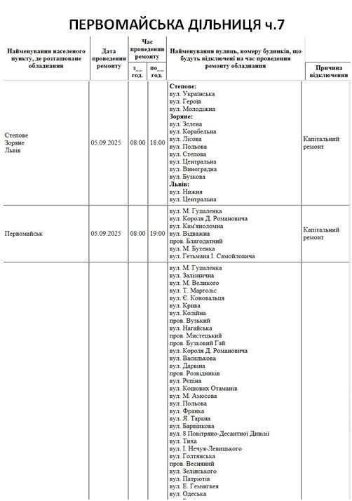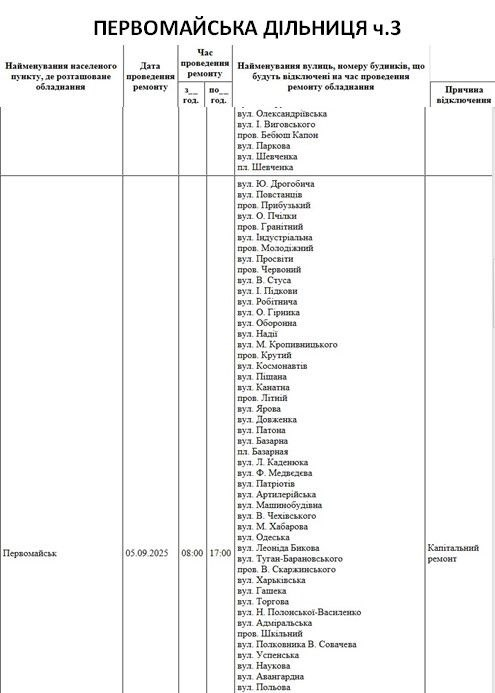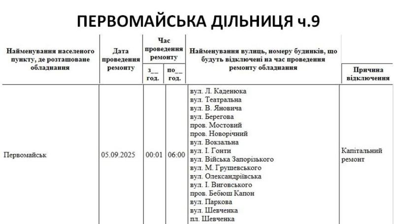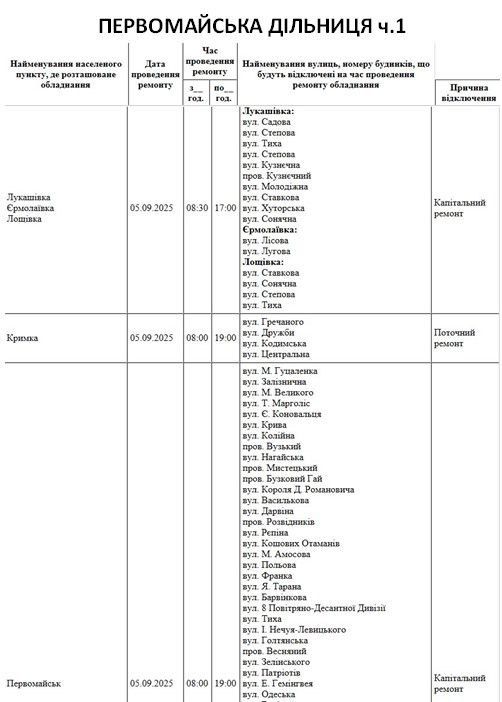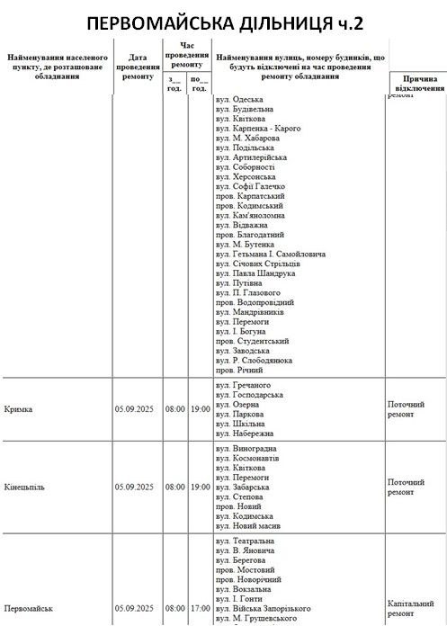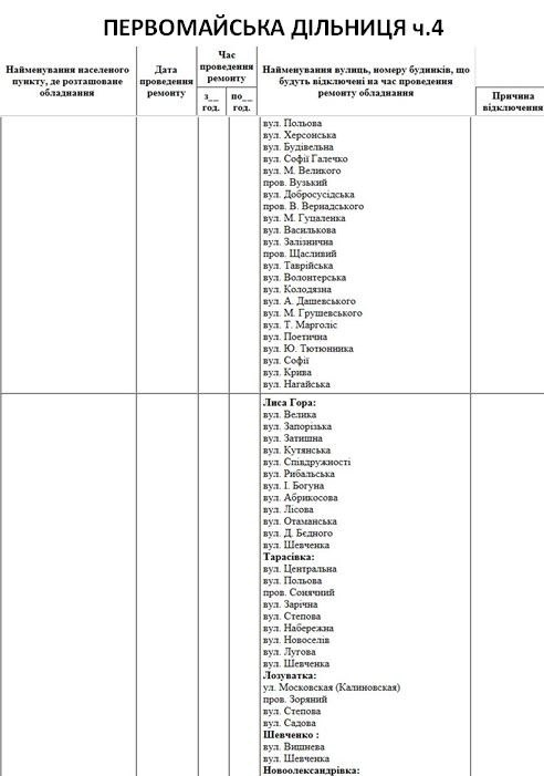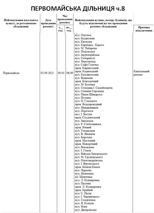 Графік відключення світла по адресах 5 вересня, Первомайська дільниця. АТ «Миколаївобленерго»