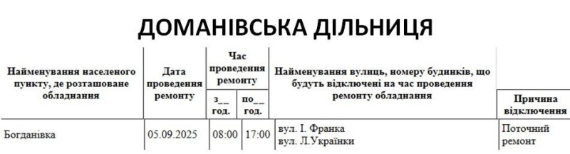 Графік відключення світла по адресах 5 вересня, Доманівська дільниця. АТ «Миколаївобленерго»
