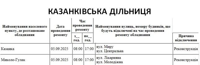 Графік відключення світла по адресах 5 вересня, Казанківська дільниця. АТ «Миколаївобленерго»