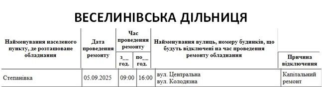 Графік відключення світла по адресах 5 вересня, Веселинівська дільниця. АТ «Миколаївобленерго»