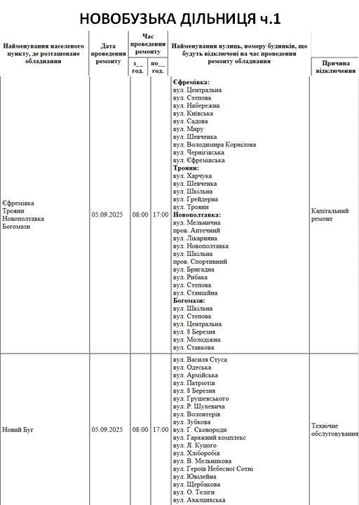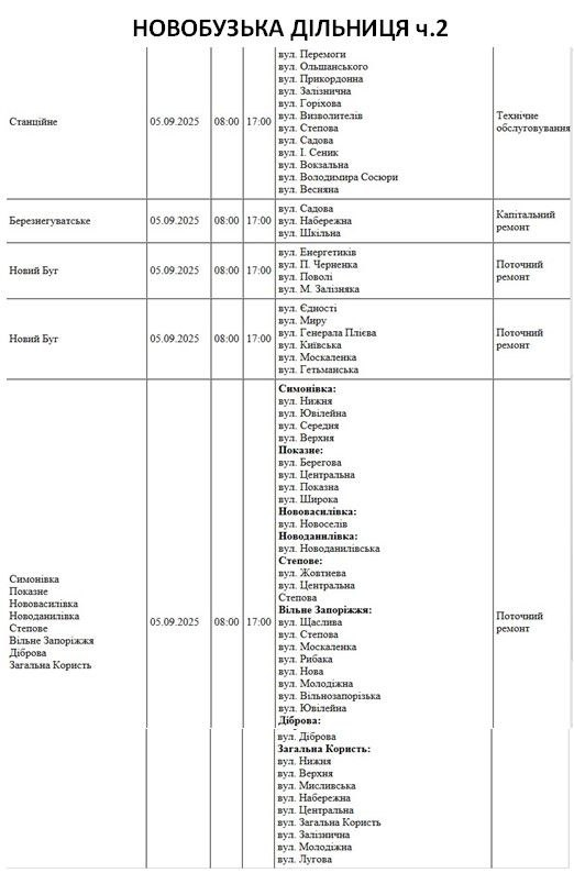 Графік відключення світла по адресах 5 вересня, Новобузька дільниця. АТ «Миколаївобленерго»