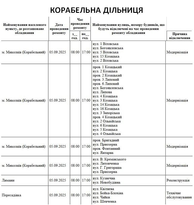 Графік відключення світла по адресах 5 вересня, Корабельна дільниця. АТ «Миколаївобленерго»