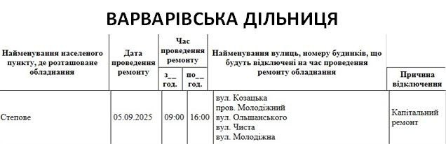 Графік відключення світла по адресах 5 вересня, Варварівська дільниця. АТ «Миколаївобленерго»