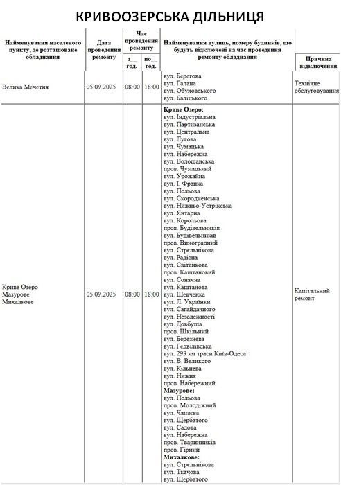 Графік відключення світла по адресах 5 вересня, Кривоозерська дільниця. АТ «Миколаївобленерго»