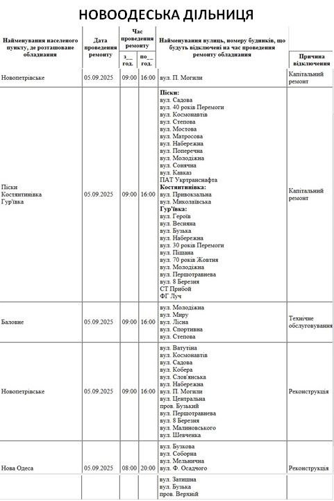 Графік відключення світла по адресах 5 вересня, Новоодеська дільниця. АТ «Миколаївобленерго»