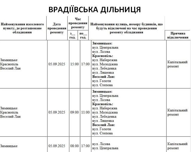 Графік відключення світла по адресах 5 вересня, Врадіївська дільниця. АТ «Миколаївобленерго»