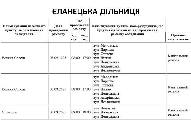 Графік відключення світла по адресах 5 вересня, Єланецька дільниця. АТ «Миколаївобленерго»