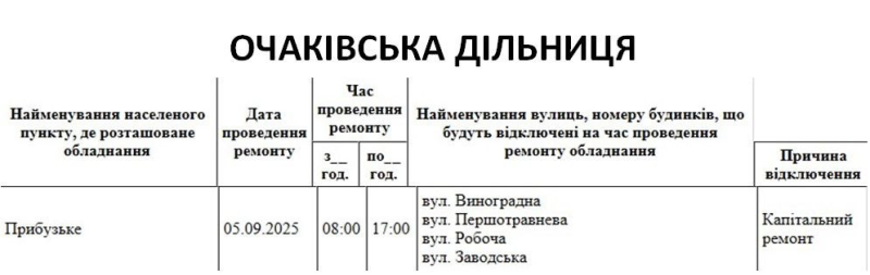 Графік відключення світла по адресах 5 вересня, Очаківська дільниця. АТ «Миколаївобленерго»