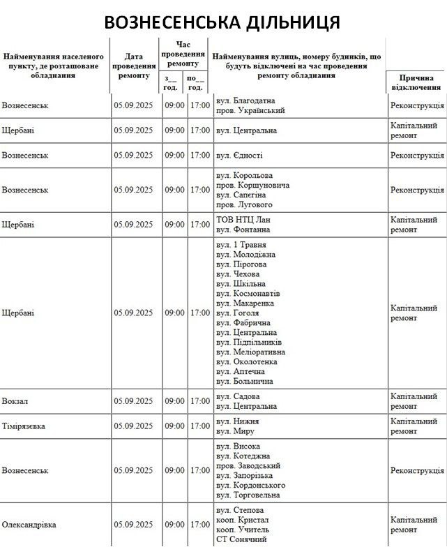 Графік відключення світла по адресах 5 вересня, Вознесенська дільниця. АТ «Миколаївобленерго»