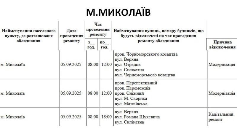 Графік відключення світла по адресах 5 вересня, Миколаїв. АТ «Миколаївобленерго»