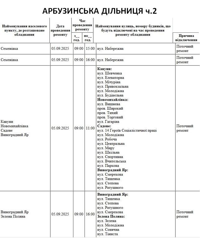 Графік відключення світла по адресах 5 вересня, Арбузинська дільниця. АТ «Миколаївобленерго»