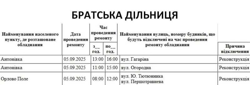 Графік відключення світла по адресах 5 вересня, Братська дільниця. АТ «Миколаївобленерго»