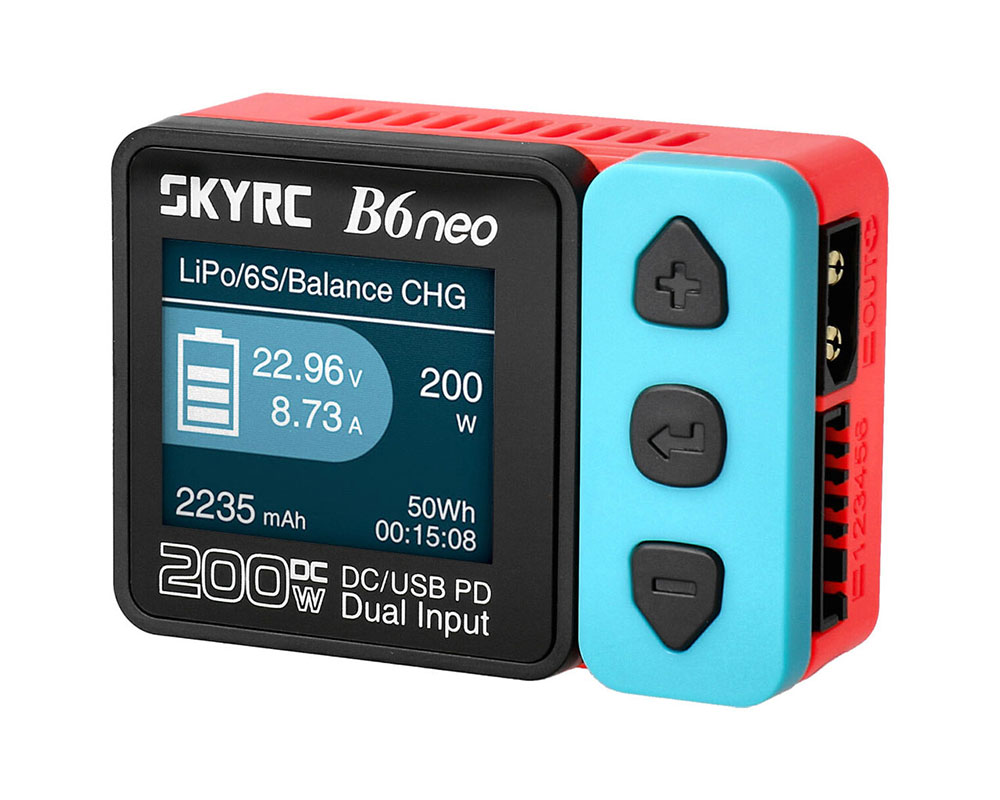 - зарядкой SkyRC D100, имеющей встроенный блок питания, позволяющий проводить зарядку/разрядку аккумуляторных батарей благодаря постоянному или переменному электрическому току. Данная модель зарядного устройства снабжена двумя высокотоковыми портами (до 10 А), обеспечивающими суммарную мощность заряда до 100 Вт. Функционал зарядки позволяет настраивать до 20 опций заряда для литиевых, никелевых и свинцовых батарей, причем управление устройством доступно также с помощью компьютера или смартфона;