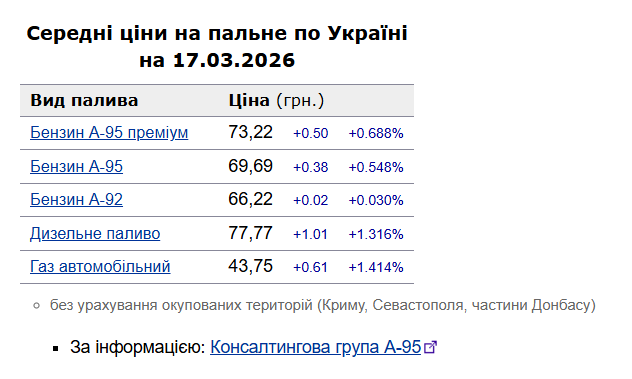 У вівторок, 17 березня, середня ціна на бензин марки А-95 зросла на 38 коп. до 69,69 грн/л, на дизельне пальне — зросла на 1 грн 1 коп. до 77,77 грн/л.