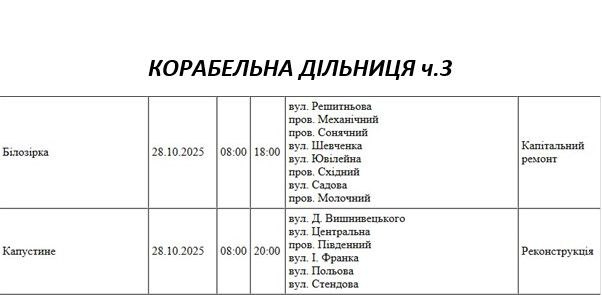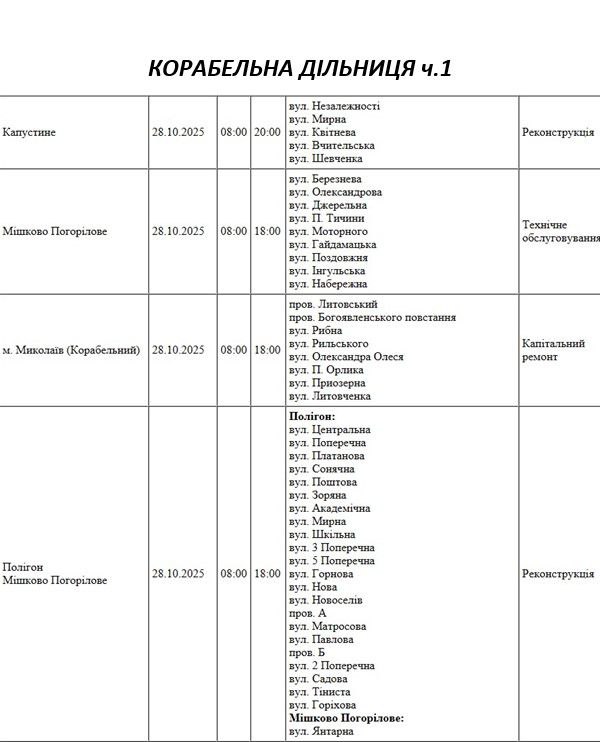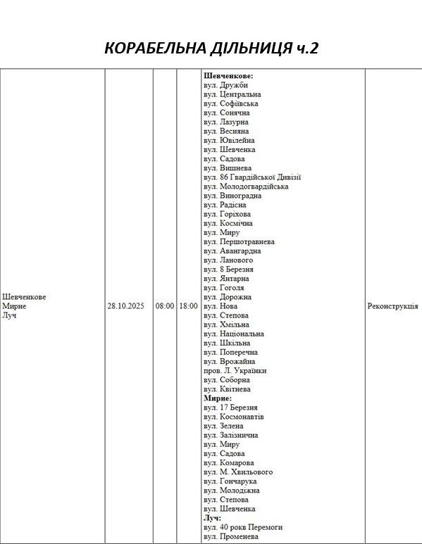 Графік відключення світла по адресах на 28 жовтня, Корабельна дільниця АТ «Миколаївобленерго»
