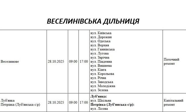 Графік відключення світла по адресах на 28 жовтня, Веселинівська дільниця АТ «Миколаївобленерго»