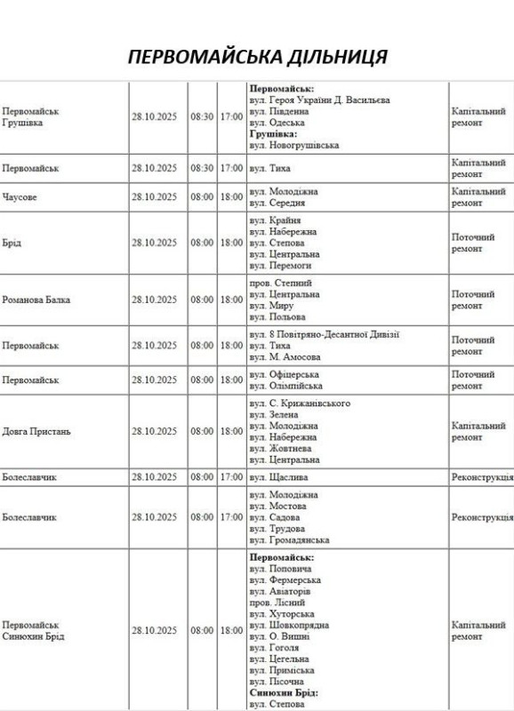 Графік відключення світла по адресах на 28 жовтня, Первомайська дільниця АТ «Миколаївобленерго»