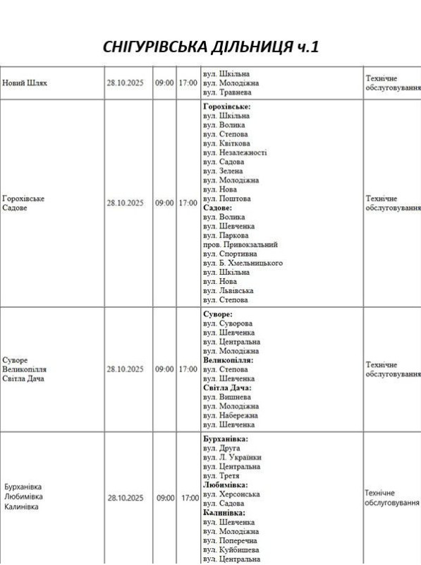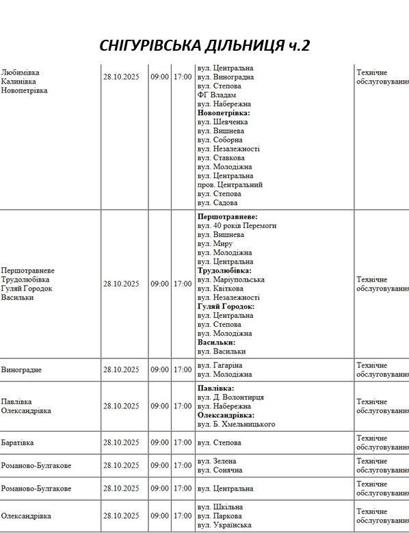 Графік відключення світла по адресах на 28 жовтня, Снігурівська дільниця АТ «Миколаївобленерго»