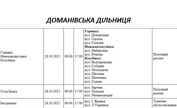 Графік відключення світла по адресах на 28 жовтня, Доманівська дільниця АТ «Миколаївобленерго»