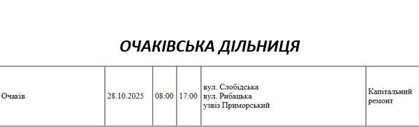 Графік відключення світла по адресах на 28 жовтня, Очаківська дільниця АТ «Миколаївобленерго»