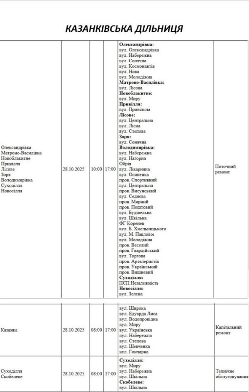 Графік відключення світла по адресах на 28 жовтня, Казанківська дільниця АТ «Миколаївобленерго»