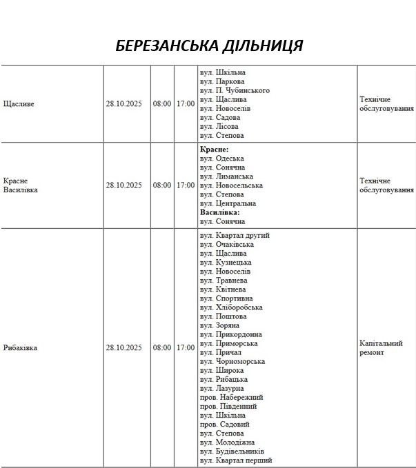 Графік відключення світла по адресах на 28 жовтня, Березанська дільниця АТ «Миколаївобленерго»