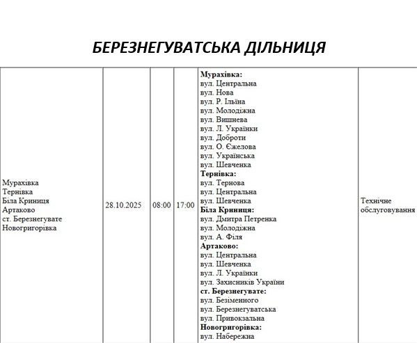 Графік відключення світла по адресах на 28 жовтня, Березенгуватська дільниця АТ «Миколаївобленерго»