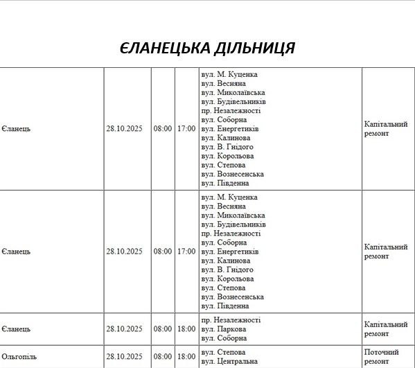 Графік відключення світла по адресах на 28 жовтня, Єланецька дільниця АТ «Миколаївобленерго»