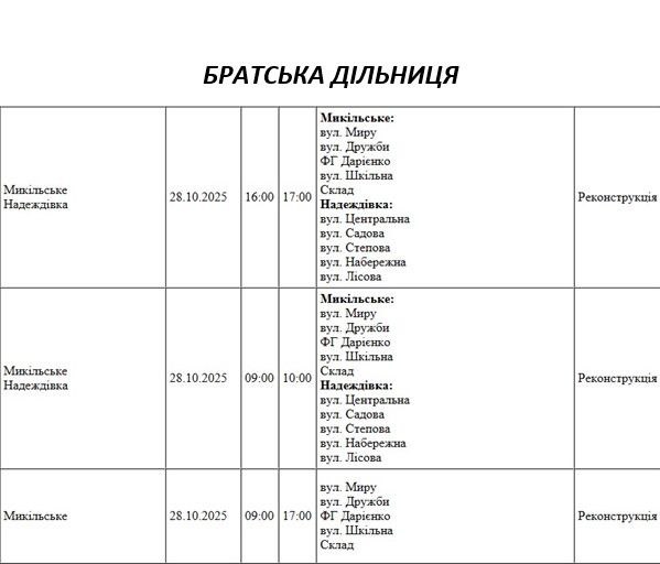 Графік відключення світла по адресах на 28 жовтня, Братська дільниця АТ «Миколаївобленерго»