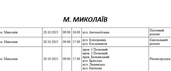 Графік відключення світла по адресах на 28 жовтня, Миколаївська дільниця АТ «Миколаївобленерго»