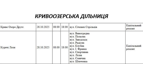 Графік відключення світла по адресах на 28 жовтня, Кривоозерська дільниця АТ «Миколаївобленерго»