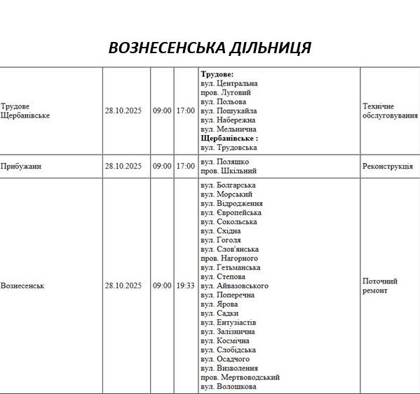 Графік відключення світла по адресах на 28 жовтня, Вознесенська дільниця АТ «Миколаївобленерго»