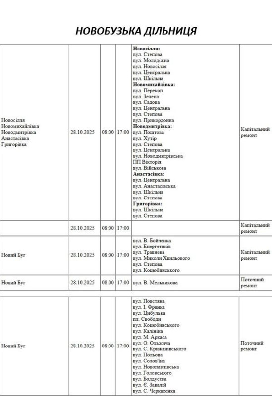 Графік відключення світла по адресах на 28 жовтня, Новобузька дільниця АТ «Миколаївобленерго»