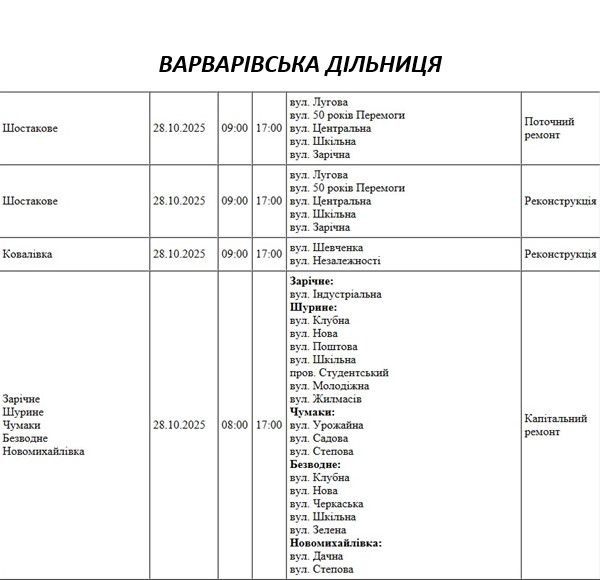 Графік відключення світла по адресах на 28 жовтня, Варварівська дільниця АТ «Миколаївобленерго»