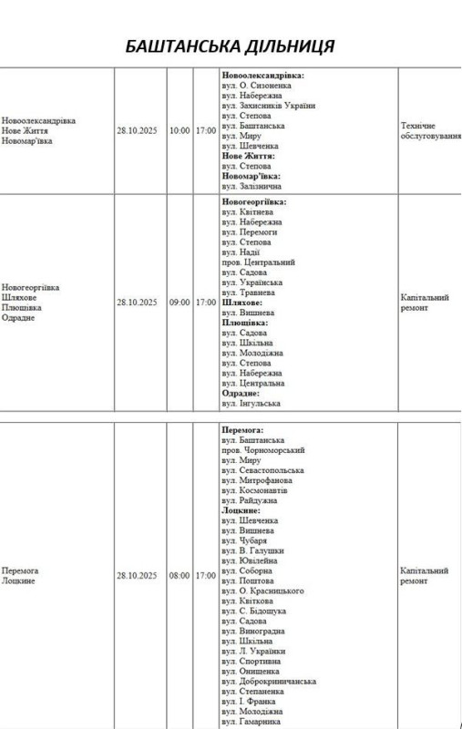 Графік відключення світла по адресах на 28 жовтня, Баштанська дільниця АТ «Миколаївобленерго»