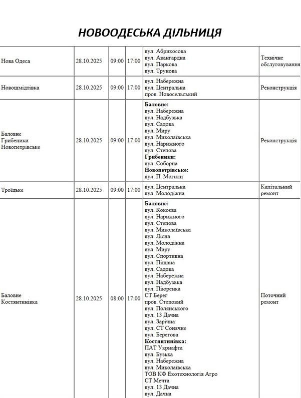 Графік відключення світла по адресах на 28 жовтня, Новоодеська дільниця АТ «Миколаївобленерго»