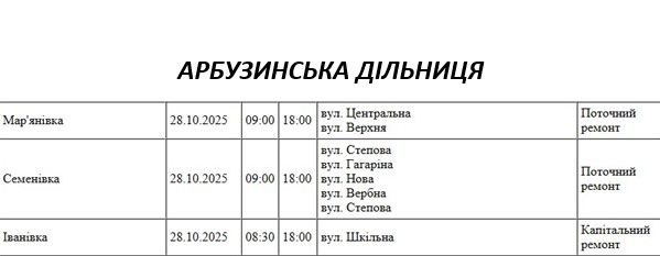 Графік відключення світла по адресах на 28 жовтня, Арбузинська дільниця АТ «Миколаївобленерго»